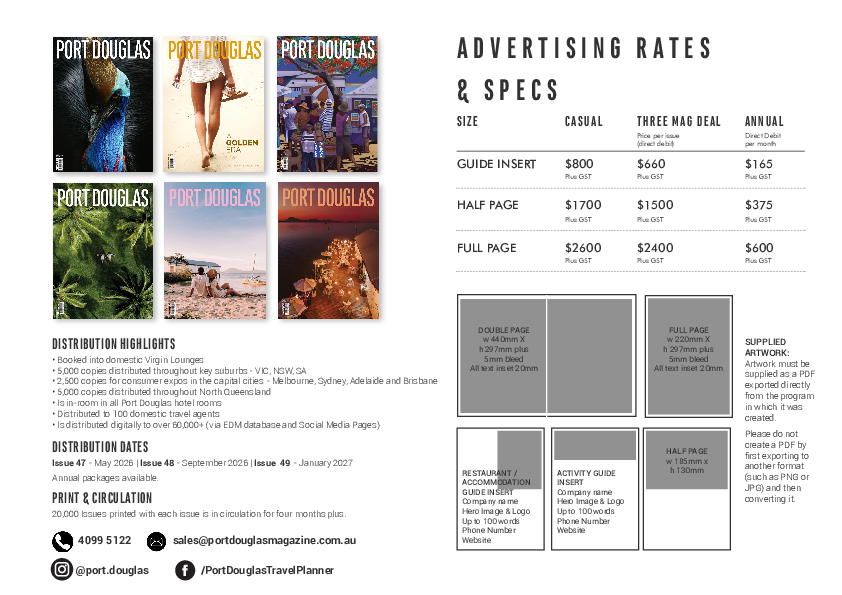 The Port Douglas Magazine is circulated throughout Port Douglas, Cairns and Daintree Rainforest. Found in almost every resort and hotel room, cafe, lobby and waiting room it provides the perfect holiday read and souvenir.